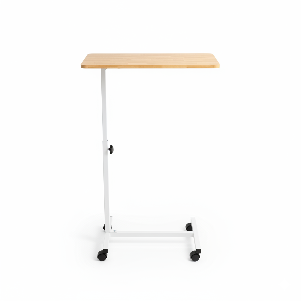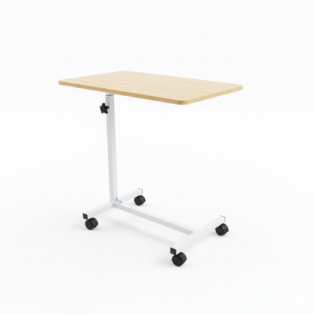 This Adjustable Overbed Table provides a stable, convenient surface for meals, reading, or activities while in bed. Its height-adjustable design accommodates various bed and chair heights, and smooth-rolling casters make it easy to position as needed. Built with a sturdy steel base and a wood-grain laminated tabletop, it combines functionality with a clean, modern look suitable for home or clinical settings.