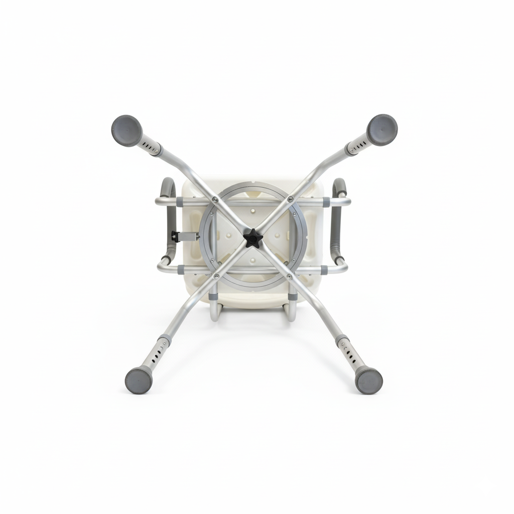 The 360° swivel seat allows easy entry and exit from the tub or shower without strain, while the ergonomic armrests and backrest provide additional balance and comfort. Built from lightweight, rust-proof aluminum, it’s easy to clean, height-adjustable, and fitted with non-slip rubber tips for firm stability on wet surfaces.