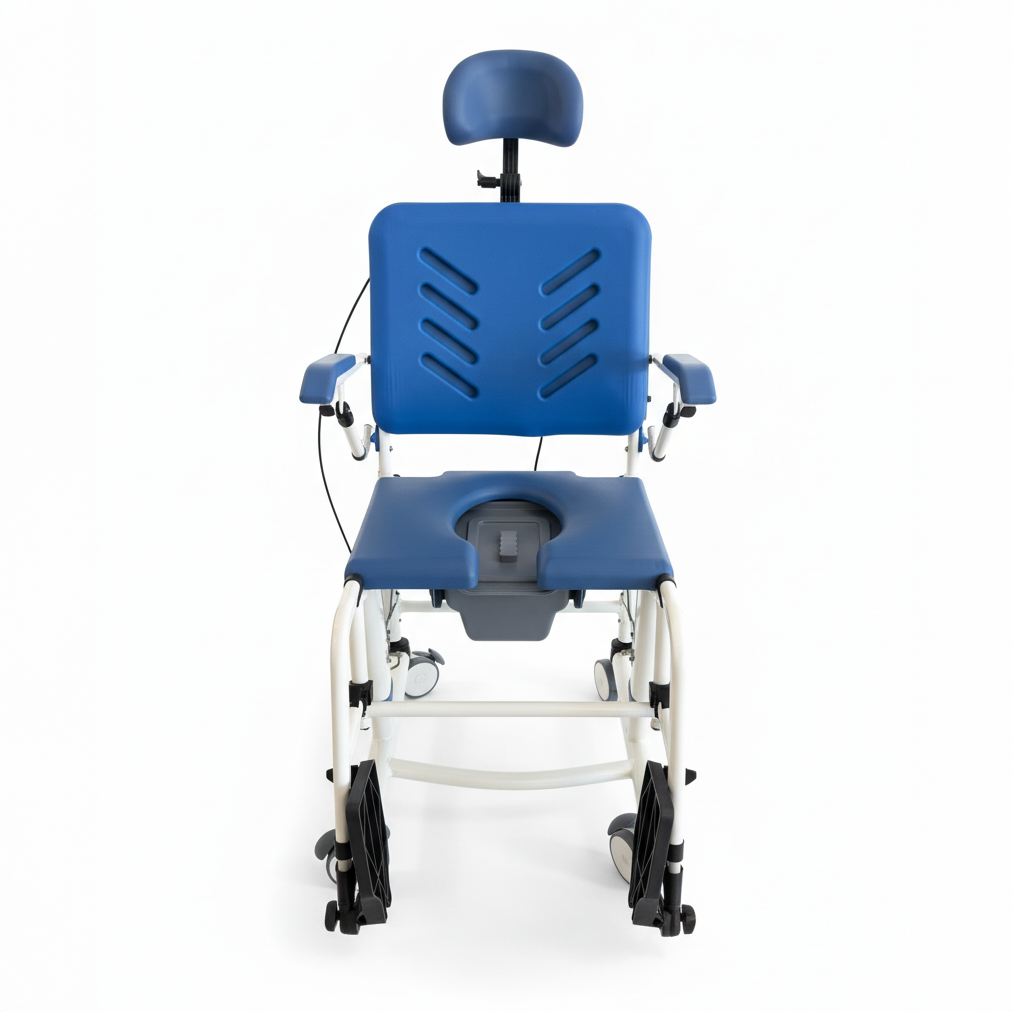 Upgrade bathing comfort and safety with the Aluminum Reclining Shower Chair with Commode — designed for reliable support and easy caregiver access.