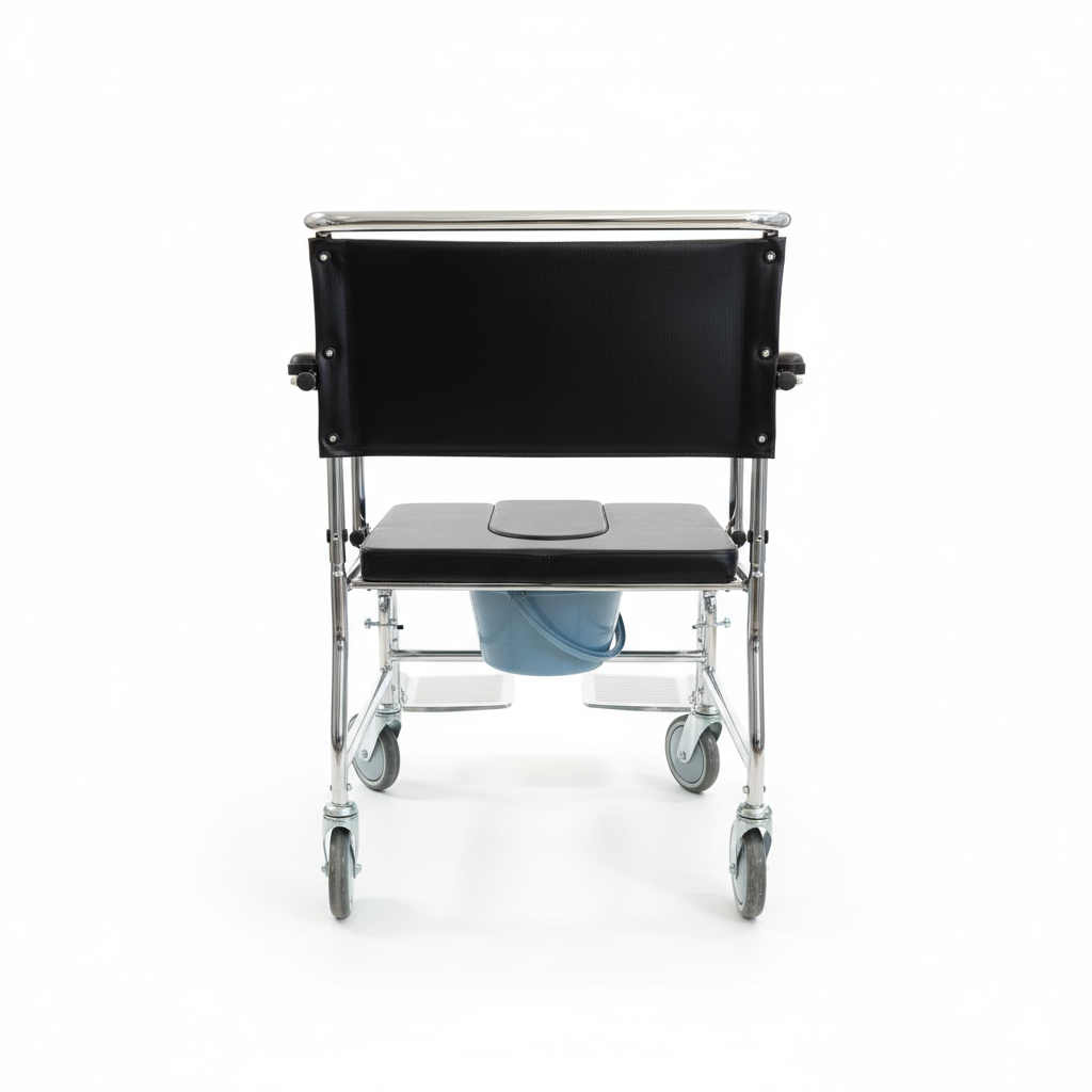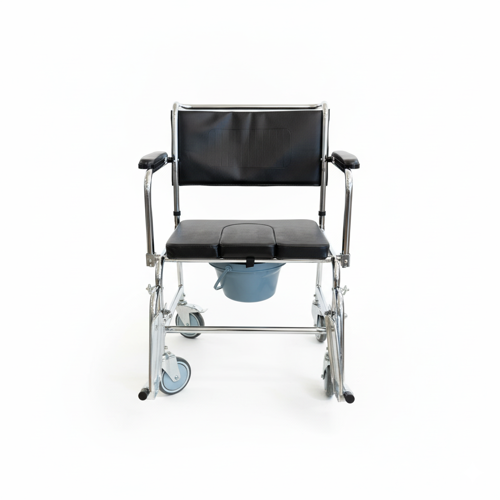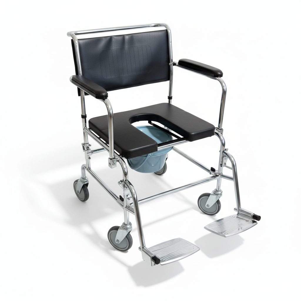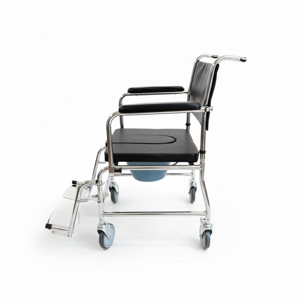 Built with a sturdy, powder-coated steel frame, the KM2695-51 ensures stability and long-lasting durability. The flip-back armrests and swing-away footrests provide easy patient transfers, while the removable commode bucket allows for quick cleaning. Its padded seat offers comfort, and the locking rear wheels add security during use.