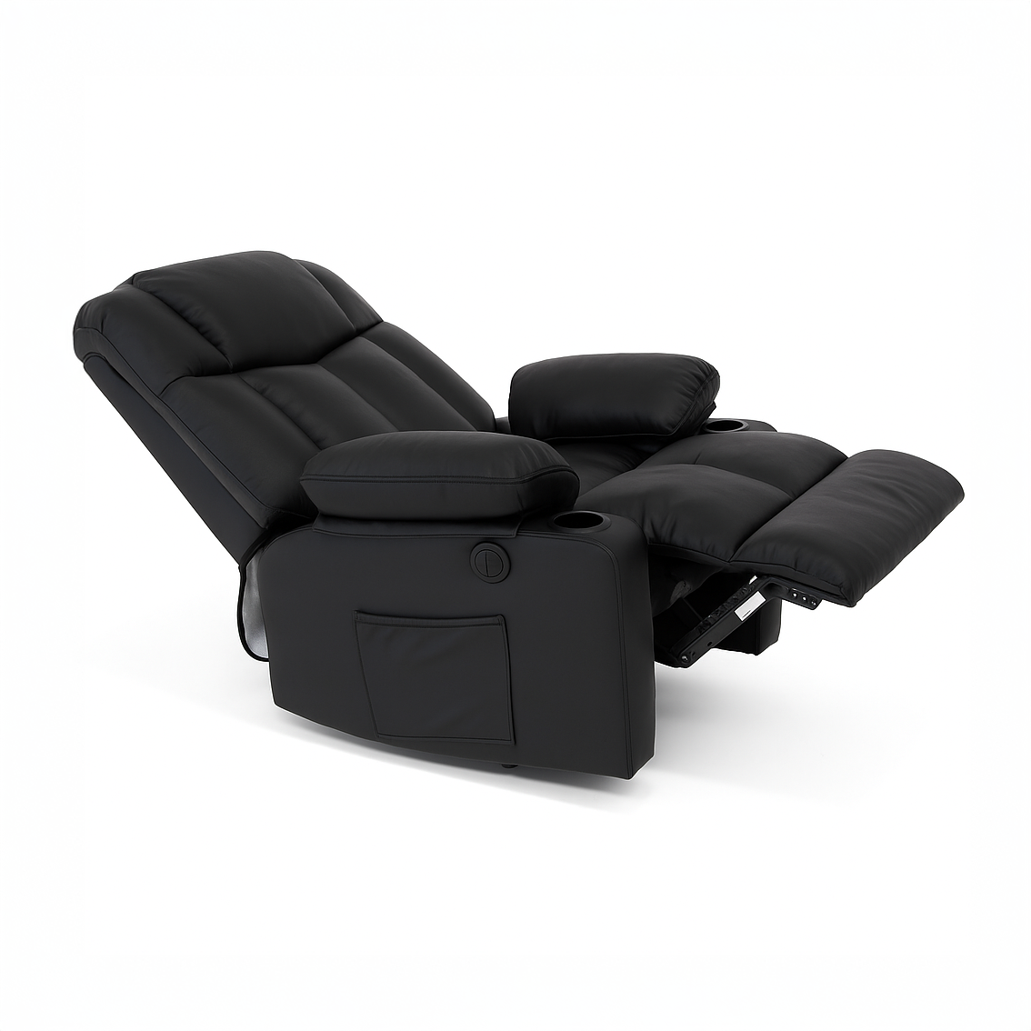 Experience unmatched comfort and convenience with the Kerae Electric Black Leather Recliner—designed for luxurious support at home or in care settings. With soft, high-quality faux leather, smooth electric reclining, and padded cushioning throughout, this chair is built for relaxation and recovery. Dual cup holders, a side storage pocket, and whisper-quiet operation make it ideal for patients, caregivers, or anyone seeking everyday ease with a premium finish.
