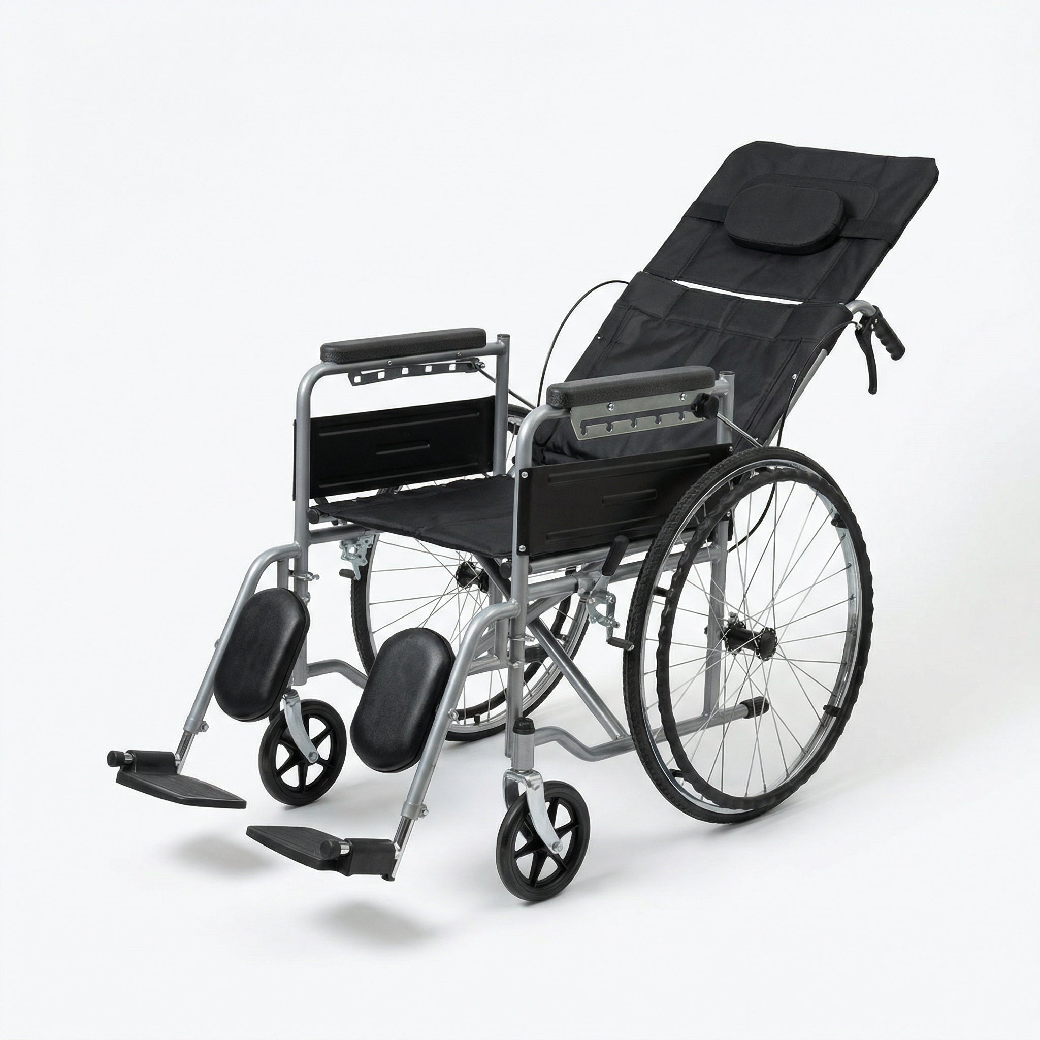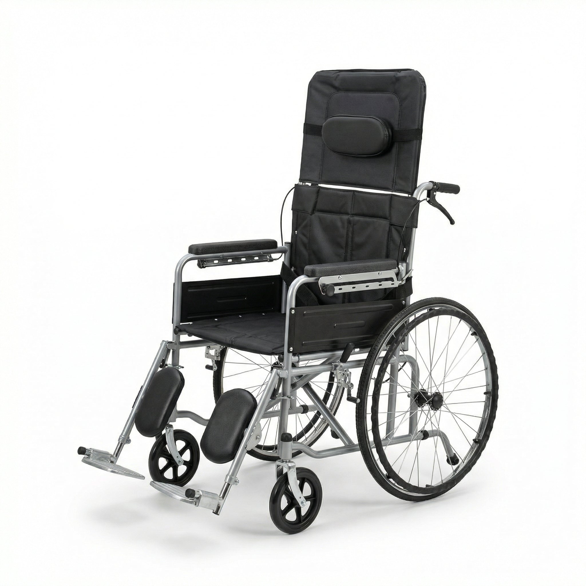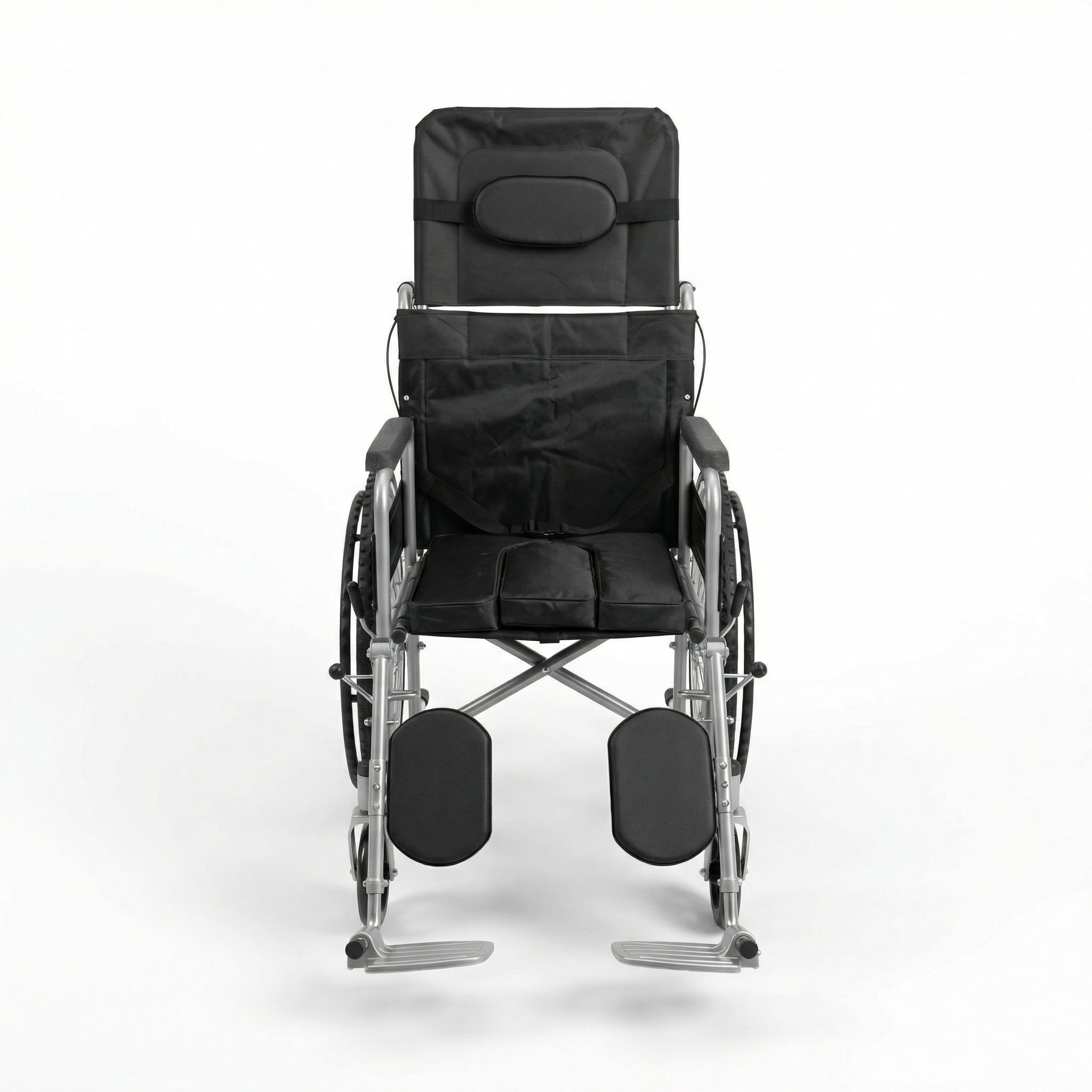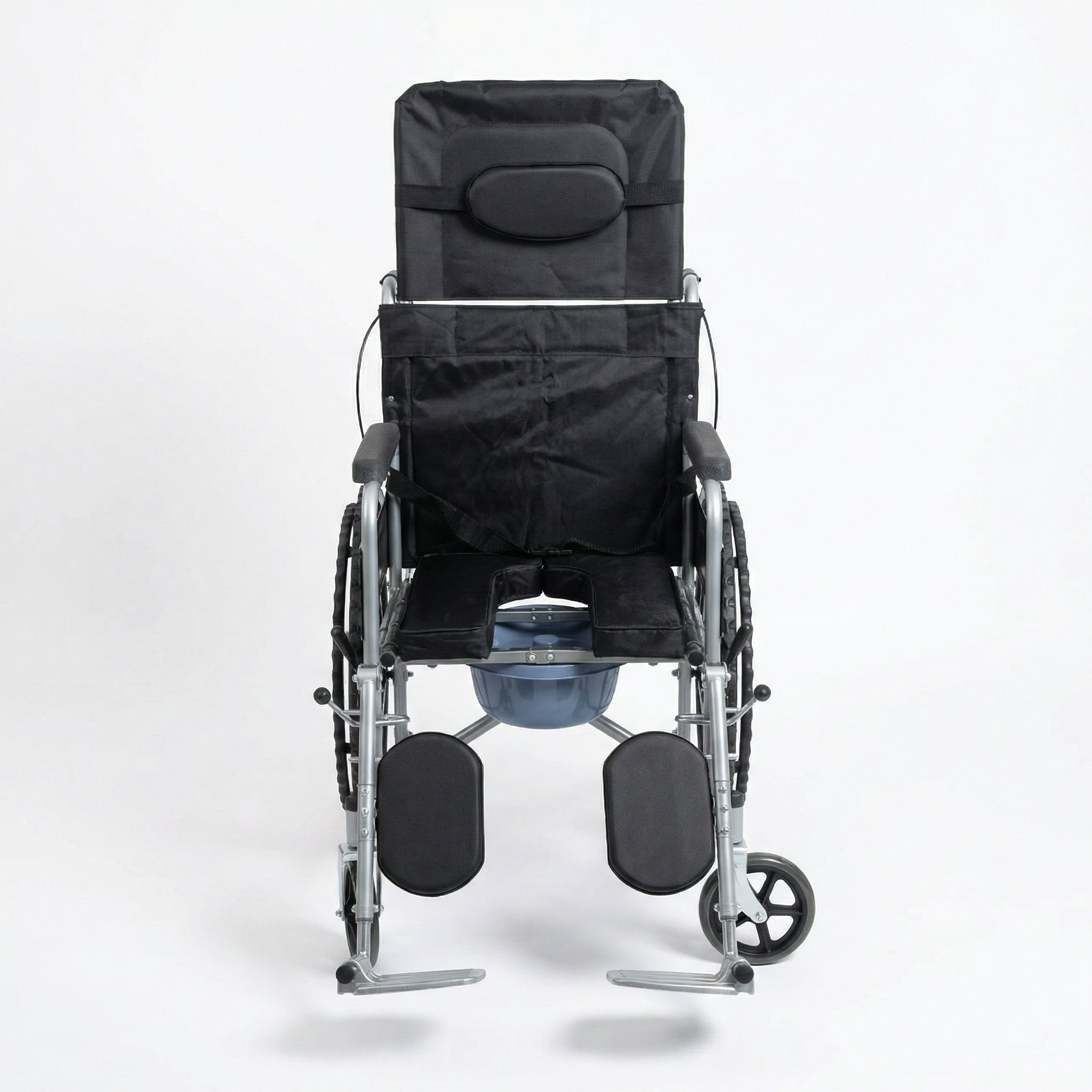 The wheelchair features a high backrest with head support, allowing multiple recline positions to reduce pressure and improve comfort during extended use. The removable commode pan enables safe and hygienic toileting without transferring the user, making it ideal for home care, rehabilitation centers, and long-term care environments.